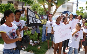 familiares e amigos da vítima estão concentrados na frente do forum, usando camisa com a foto de Ricardo e portando faixas e cartzaes com o pedido de justiça.