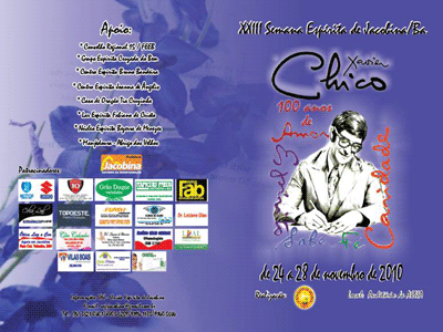 A abertura da 23ª Semana Espírita de Jacobina acontece dia 24, quarta-feira, com a participação do expositor Itamar Muritiba (Juazeiro-BA), que abordará o tema “Emanuel: Interpretação do Evangelho”. Na quinta-feira, dia 25, será a vez do expositor Marcel M. Cadidé (Salvador-BA), abordando o tema “André Luiz e o Mundo Espiritual”. Na sexta-feira, dia 26, a vez será da expositora Abigail Guimarães (Vitória da Conquista-BA), com o tema “Chico Xavier e o Correio do Além”. No sábado, dia 27, acontece a palestra “Os Ensinamentos na Obra do Irmão X”, com o expositor Cláudio Emanuel (Salvador-BA). O evento será encerrado na noite do dia 28, domingo, com o expositor André Luiz Peixinho (Salvador-BA), abordando a temática central “Chico Xavier: 100 anos de Amor”.