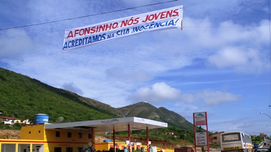 “Como pode alguém ser preso só porque teve o nome citado por um ladrão”, questionava a funcionária pública Ana Andrade de Oliveira, 25 anos. Ela que reside no distrito de Pedra Vermelha chegou cedo a Monte Santo e viu diversas faixas que foram fixadas em todos os acessos ao centro da cidade e logo notou que havia uma grande mobilização a favor do bancário João Marcos Afonso dos Santos. Faixas, cartazes e pintura nos parabrisas dos carros com o nome do acusado “Afonsinho inocente” estava por toda a parte.