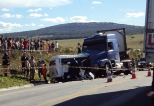 Um acidente envolvendo uma Kombi e uma carreta deixou cinco pessoas mortas na tarde deste sábado (19), na BR-116, próximo à Lagoa das Flores, em Vitória da Conquista. De acordo informações da Polícia Rodoviária Federal (PRF), o condutor da Kombi, com placa EAY-4654, de Caraguatatuba/SP, teria invadido a pista contrária e batido de frente com a carreta.