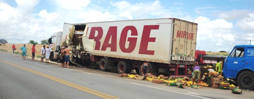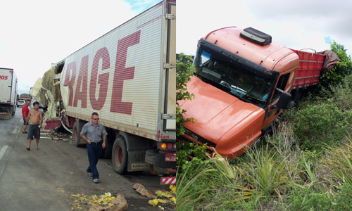 Duas carretas se envolveram em um acidente na BR 116 próximo a Tucano, por volta das 8h10 deste domingo, 27. O acidente aconteceu no entroncamento entre a BRs 116 e 410 que liga a cidade de Ribeira do Pombal. A carreta de cor vermelha e placa policial HFD 9110, licença de Governador Valadares-MG carregada de sal, que retornava de Mossoró RN, colidiu com outra, tipo baú de cor branca e placa policial IRJ 6648 ,licença de Vacaria RS, carregada de melão, que vinha sentido Ribeira do Pombal/ Feira de Santana. A colisão aconteceu de forma lateral e não causou ferimentos aos motoristas.