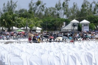 Os portões já foram abertos e neste momento um quarteto de cantores entoam músicas conhecidas dos católicos. A abertura dos trabalhos de palco foi feito pelo padre Aderbal Galvão, vigário da Paróquia São Pedro. Um quarteto cantando com um grande público com a cançao bastante conhecida pelos católicos. “Quando eu cheguei aqui meu senhor estava”
