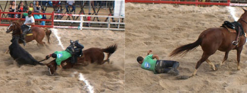 São seis bois, destacados para cada dupla inscrita. No primeiro dia, os três bois corridos por cada dupla, valem, respectivamente, 08, 09 e 10 pontos. No segundo dia, são corridos os de 11, 12 e 13 pontos. A disputa de prêmios acontece apenas entre os que conseguiram atingir 63 pontos, com um boi para cada, em sistema de eliminação. A pista de corrida tem uma camada de areia de 40 cm o que favorece a corrida dos cavalos, o impacto da queda dos bois e muitas vezes do vaqueiro, a exemplo de Lucas, que, no sábado ás 14h30min, provocou um susto ao cair do cavalo, juntamente com o boi e, ficou por alguns minutos deitado na pista enquanto aguardava o médico. “Vaqueiro é como televisão, sai do ar por alguns instantes e volta logo em seguida”, falou o locutor assim que Lucas levantou e saiu caminhando normalmente.