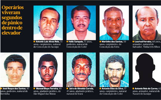Os corpos dos nove operários mortos na queda de um elevador em Salvador na manhã desta terça-feira (9), ja foram identificados e serão liberados ainda nesta terça-feira,pelo IML (Instituto Médico Legal) Nina Rodrigues. A construtora responsável pela obra contratou os serviços de uma funerária que fará o transporte dos corpos, já que a maior parte das vítimas é do interior da Bahia e estava na capital baiana por causa do trabalho na obra, como é o caso do carpinteiro Antônio Elias da Silva, natural de Conceição do Coité, precisamente da fazenda Umburanas- região do distrito de Juazeirinho.
