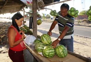 A agricultora Rejane dos Santos França, 31 anos, 02 filhos, falou que chega a vender R$ 70 por dia, quando o movimento é bom. Ela disse que a maioria dos produtos comercializados, ou seja; coco, pinha, melancia e ovos, são produzidos na pequena propriedade de 03 tarefas pertencente ao sogro. “No momento, só não estou cultivando a melancia por causa do tempo seco, porém, estamos comprando de Juazeiro, mas, quando chover se Deus der bom tempo, nós também plantaremos”, contou Rejane, enquanto atendia ao mestre de obras Marivaldo P. dos Santos, que disse ao CN que para sempre para comprar frutas, de modo especial a pinha e a melancia.