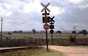 Estes postes (trilhos) contam com um sistema de energia solar, que alimenta um semáforo que sinaliza a passagem dos trens.