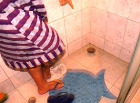 A aposentada Bia de Biliu conta que sofreu um derrame há dois anos e além da idade perdeu parte dos movimentos. De pés descalços ela tentar empurrar a água para fora. “Aqui é terrível, a gente sofre com o mau cheiro e até fezes são vistas na cozinha, debaixo da pia”, contou a aposentada. E aproveitou para mostrar a parte baixa do sofá encharcada em consequecia da água que saiu do esgoto.