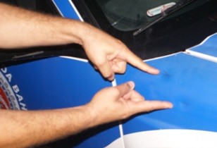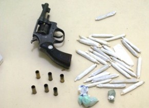Em poder da vitima foi encontrado um revólver calibre 32 com seis cartuchos deflagrados, desses dois passaram de raspão na viatura e 28 dolões de maconha.