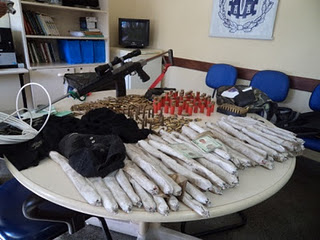 Com os acusados foram encontrados dois veículos (uma caminhonete S-10 e uma pickup Pegeout), um fuzil 556 (de uso restrito), um revólver calibre 38, munições de diversas armas, três márcaras de pano (“brucutus”) e 50 unidades de dinamite (usadas para explodir caixas eletrônicos). De acordo com a polícia, o material estava enterrado no sítio onde os acusados foram presos.