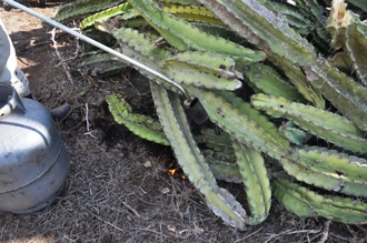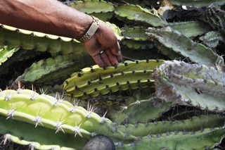 Segundo ele, essa quantidade que pode ser visto na foto não é suficiente para alimentar os animais, “é necessário quatro vezes por dia este volume que corresponde de 12 a 15 pés de mandacaru grande. “Tenho que alimentar todo dia oitenta cabeças de boi e vaca, derrubando o mandacaru e depois que arrumo a moita volto queimando os espinhos. A missão é grande, de quando eu cheguei aqui até hoje morreram quatro reis, e agora dificultou mais ainda, pois até a água que estava vindo da Barragem do Cedro de caminhão para cá, a prefeitura proibiu pegar. Eles estão falando que é por precaução, pois a agua é boa até para o consumo humano e se a coisa piorar a população vai consumir dela. A alternativa de água agora é na barragem do rio jacuípe, que é pouca também”, observou Manoel.