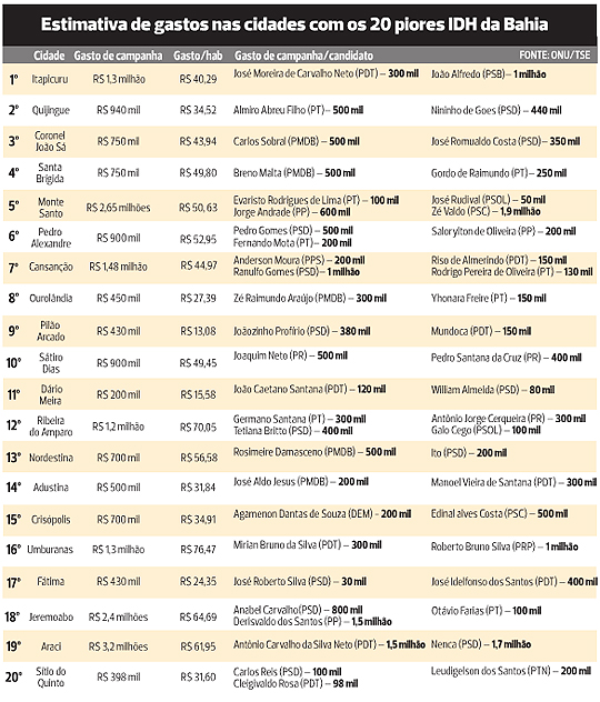Entre as 20 cidades que estão na rabeira do IDH baiano, Umburanas é a campeã no gasto de campanha. Mas não está sozinha. Juntos, os candidatos dos municípios menos desenvolvidos planejam gastar R$ 21,6 milhões nas eleições, média de R$ 45,74 por pessoa. Na maioria dos municípios da lista, apenas dois postulantes concorrem e, em 13 deles, a população não passa de 20 mil.