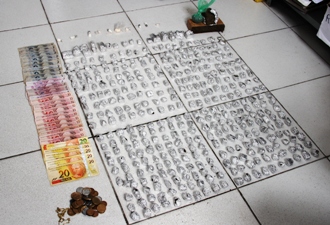 Um tablete de maconha pesando aproximadamente 150g, outro 50g, 386 trouxinhas de maconha, quatro pedras de crack, seis papelotes de cocaína, um papelote contendo pasta base da mesma droga, os três comprovantes de depósito no valor total de R$ 1.250, uma corrente de pescoço tipo michellin e um chip da OI, esses últimos ele disse pertencer a esposa Ednéia Lima, 20 anos, cuja mesma informou a polícia que estava sendo agredida justamente por dizer que iria sair de casa por conta do seu envolvimento com droga.
