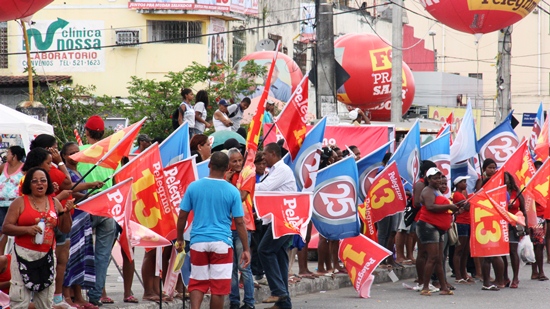 Militantes ocupam as calçadas, portando bandeiras dos dois candidatos, o mais curioso é a forma democrática que pode ser visualizada na foto, pois Pelegrino recebe apoio do ex-presidente Lula e no entanto, correligionários do principal adversário ACM Neto estão infiltrados na manifestação petista.