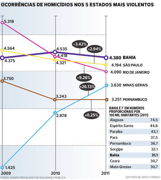Com mais de 4,3 mil assassinatos registrados em 2011, a Bahia ficou pelo segundo ano consecutivo na liderança em número de ocorrências de homicídios. Os dados são da 6ª edição do Anuário Brasileiro de Segurança Pública, produzido pelo Fórum Brasileiro de Segurança Pública e divulgado nesta terça, em São Paulo. Apesar de uma leve redução de 3,42% de 2010 para 2011, o estado manteve a liderança que nos anos de 2008 e 2009 era do Rio de Janeiro.