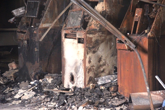 Uma equipe começou o trabalho de retirada dos caixas eletrônicos que ficaram totalmente destruídos pelo fogo que teve inicio por volta das 03h da madrugada e só foi controlado pouco depois das 09h com a chegada do corpo de bombeiro de Feira de Santana.