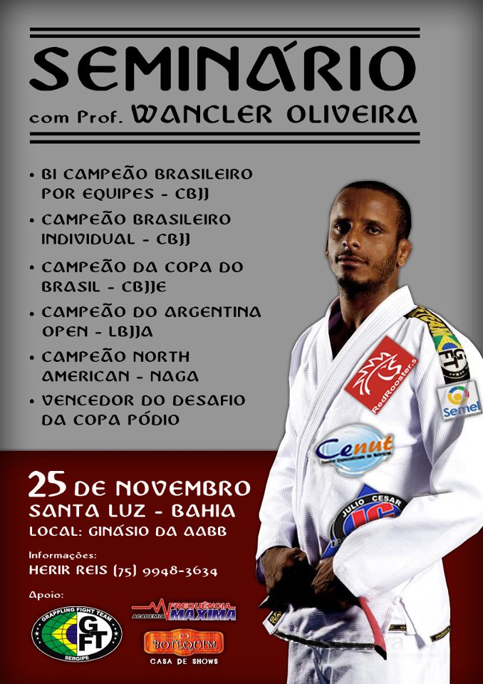 No próximo domingo dia 25 de Novembro, acontecerá na AABB em Santaluz a partir das 08h30 um Seminário de Jiu Jitsu ministrado por Wancler Oliveira (Faixa Preta da Equipe GFTeam Sergipe).