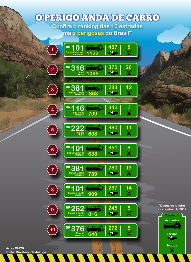 No período de 16 de dezembro de 2010 a 2 de janeiro de 2011, a PRF registrou 11 mil acidentes que causaram 478 mortes e 6 mil feridos. O tipo de acidente com maior número de mortes foi a colisão frontal (36%), enquanto o segundo lugar ficou com atropelamentos de pedestres em rodovias (17%).