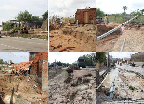 Paralelo à casa que desabou, na pista da estrada vicinal ligando a sede do município aos Povoados de Nova Palmares, Laginha e Boa Vista, abriu três crateras e numa ação emergencial, caçambas locadas pela Prefeitura trabalhavam no local e aterravam, utilizando os entulhos deixados na queda do muro do almoxarifado.