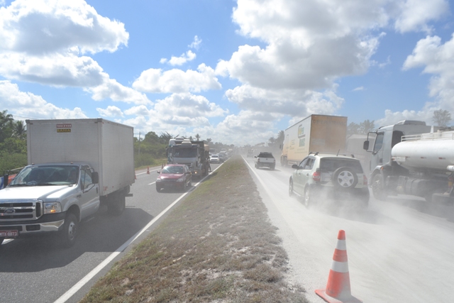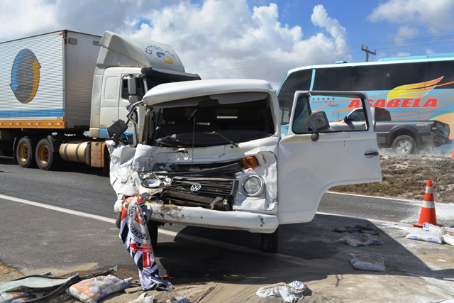 “L” na pista, quando outra carreta, que se aproximava, diminuiu a velocidade para evitar uma colisão. Um terceiro veículo, um Mercedes Benz 1113 que seguia no sentido Feira- Salvador, tentou desviar batendo na carroceria da segunda carreta e passou para a outra pista colidindo frontalmente com uma Kombi branca de placa JQW 8699, que ficou atravessada na pista.