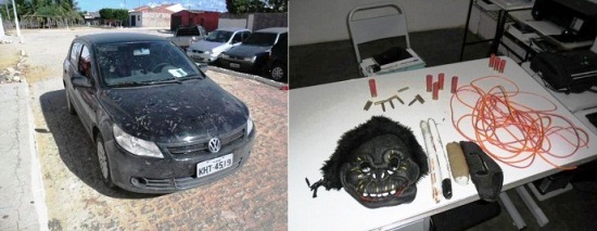 Foram encontrados no interior do veículo, três emulsões explosivas, aproximadamente dez metros de estopim,onze estojos deflagrados de cartuchos 5,56mm; cinco estojos de cartuchos deflagrados cal 12, uma mascara; um coldre para arma; um CRLV do veículo VW/GOL placa KHT-4519- Olinda/PE; um aparelho de som automotivo Pionner com controle remoto e as chaves do veiculo.