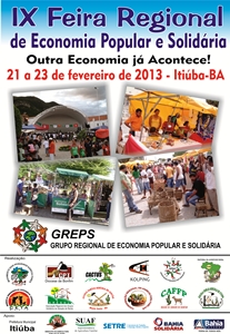 O Grupo de Economia Popular Solidária – GREPS realiza nos dias 21,22 e 23 de fevereiro, a Feira Regional de Economia Popular Solidária, na cidade de Itiúba. Cerca de 60 empreendimentos vindos das regiões de Bonfim, Cansanção e Jacobina vão se reunir para expor suas experiências em Economia Popular solidárias do campo e da cidade. Entre elas estão os diversos tipos de artesanatos, grupos produtivos solidários de caprinos e ovinos, beneficiamento de frutas nativas, alimentos agroecológicos, confecções, frutas e verduras orgânicas cinema solidário, entre outras. Uma outra Economia é Possível! A feira será realizada na Praça da Prefeitura de Itiúba. A abertura oficial será no dia 21, às 19h.