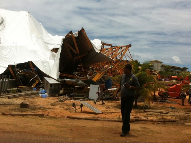 Relatos – Gilvani Ferreira, que trabalhava na montagem da estrutura quando o acidente aconteceu, revela que os operários trabalhavam na finalização do palco quando um forte vento derrubou parte da estrutura. “Eu consegui correr a tempo, foi a mão de Deus, mas tinha muita gente lá ainda, em cima”, conta o auxiliar de montagem, que só teve ferimentos leves.