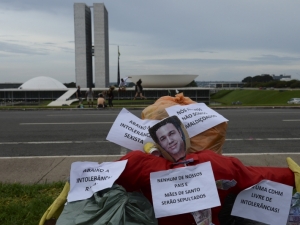 Brasília – Manifestantes penduraram na tarde de sábado (30), em frente ao Congresso Nacional, um boneco do deputado federal Marco Feliciano (PSC-SP), presidente da Comissão de Direitos Humanos da Câmara, representando a tradicional malhação de Judas.