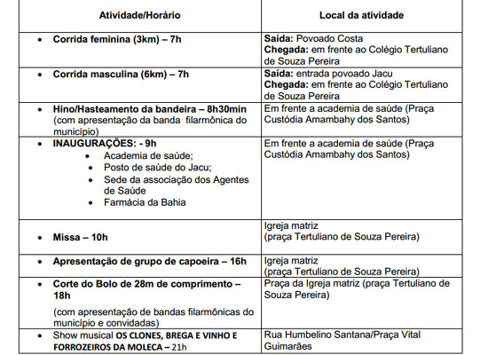 O feriado municipal ainda contará com diversas apresentações culturais e a noite, no palco, festa com “Os Clones”, Brega & Vinho e Forrozeiros da Moleka”.