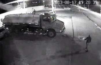 Na primeira parte do vídeo o assassino passa pela frente do caminhão com um vasilhame que vai ser usado como disfarce para comprar gasolina, por cima do tanque do caminhão pode ser visto o segurança sentado na moto.Na segunda parte a câmara mostra o sentido oposto e a última o momento do assassino comprando a gasolina.