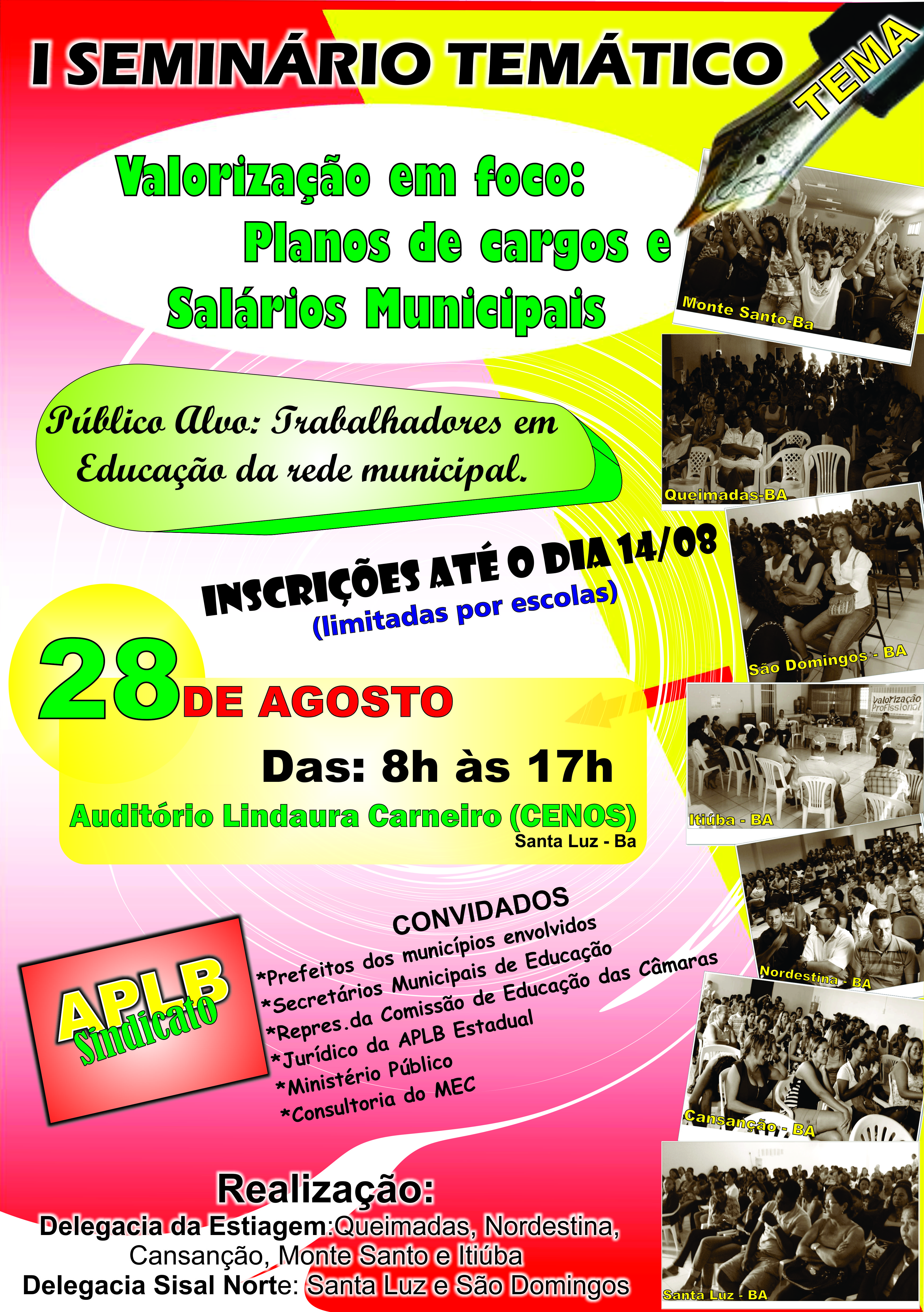 CARTAZ - SEMINÁRIO APLB (1)Acontecerá no dia 28 de agosto (próxima quarta-feira) o I Seminário Temático: Valorização em Foco: Planos de Cargos e Salários, no município de  Santaluz, no horário das 8h às 17h, no Auditório do Colégio CENOS. Esse evento está sendo organizado pelas APLB´S /Sindicato dos Municípios de Santaluz, São Domingos, Queimadas, Nordestina, Cansanção, Itiúba e Monte Santo.