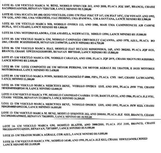 Veja a lista abaixo dos itens que irão a leilão, bem como o lança mínimo de cada veículo ou máquina: