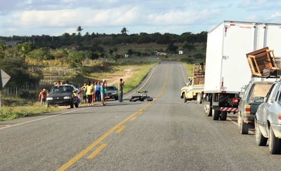 O motociclista bateu no carro que transportava um boi e tentava acessar a rodovia depois de sair de uma estrada vicinal da “Toca” e caiu numa distancia de quase dez metros fora da pista, embora consciente até a chegada do socorro, era visível a fratura do fêmur da perna direita além de outros ferimentos pelo corpo.
