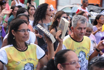 Os participantes do encontro saíram em procissão às 15h30 ao som da Banda Católica Manto Azul liderada pelo vocalista André que animou a multidão.