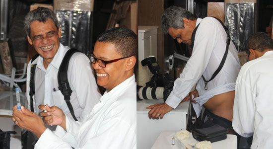 O fotografo oficial do governador Jaques Wagner, Manu Dias passou maus momentos em Araçás. Enquanto se posicionava para um bom ângulo,tropeçou no carpete que forrava o piso do palanque e torceu o pé. Sentindo muitas dores, Manu se valeu de uma loja de moveis e eletrodomésticos, onde recebeu uma equipe médica e ali mesmo, de pé, arriou a calça e recebeu uma agulhada,para “aliviar” a dor, pouco minutos depois estava ele novamente fotografando mesmo mancando.O colega dele Raimundo Mascarenhas não perdeu a oportunidade de registrar o momento da aplicação da injeção e até brincou: o pior seria se a contusão fosse nos braços. Depois de recuperado, ele disse ao CN que já havia sofrido lesão no mesmo local.