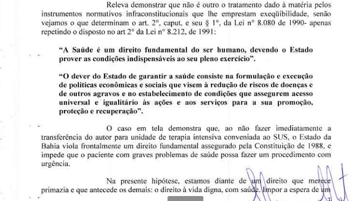 liminar-reproducaoDo ponto de vista médico, o atraso no atendimento, já que a criança nasceu com diversos problemas cardíacos e necessita de intervenção cirúrgica urgente, compromete a vida do pequeno paciente. Do ponto de vista jurídico, a postergação do cumprimento da decisão e a clara omissão do Estado da Bahia, que sequer se manifestou sobre a determinação judicial em questão, retratam o descaso como são tratados fatos dessa ordem.