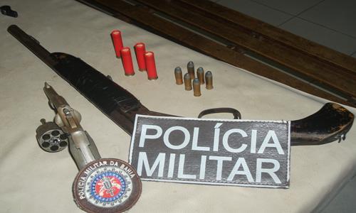 Com o adolescente que irá completar 18 anos em abril deste ano, foram encontradas duas armas de fogo [revólver] cal. 38 com 06 (seis) cartuchos intactos e uma espingarda cal. 32 com quatro cartuchos, além de um celular da marca Nokia.