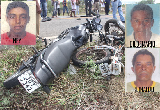 Ney Anselmo de Santana, 21 anos, morador do Povoado Ouro Verde em São Domingos, irmãos Gildemario Pereira dos Santos, 30 e seu irmão Reinaldo Pereira dos Santos, 42 anos, residentes no centro do mesmo município, morreram em uma colisão frontal envolvendo a moto Honda Fan de placa JOT 7342 licença de Dias D’ávila, e a Honda CG 125 com placa irregular com dados como sendo da cidade de São Paulo com as letras SP-171, que era ocupada pelos irmãos.
