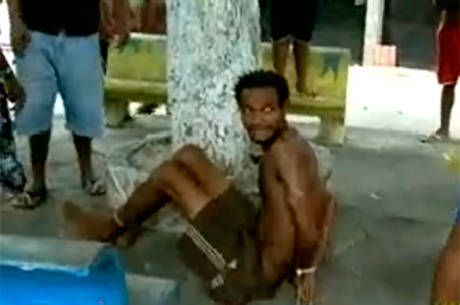 Revoltados, os moradores amarraram o homem e deram vários chutes contra o acusado. Uma moradora tentou protegê-lo.