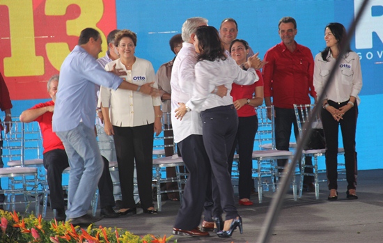 Vez em quando durante a convenção no intervaalo entre um discurso e outro o pessoal responsável pela sonorização soltava uma música, quando era de Lula lembrava a mais tocada de toda história “Lula lá lá”, foi apresentada a que vai movimentar a campanha de Dlma e de Rui e num determinado momento soltou um “forrozinho”. O governador Wagner puxou pelo braço a esposa Fátima Mendonça a “Fatinha” como a chama carinhosamente, e deu um giro no autentico pé de serra, Rui tentou fazer o mesmo, mas a timidez da sua esposa deixou ele dançando sozinho.