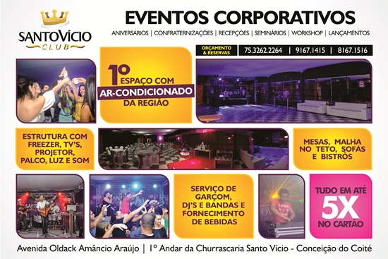 No primeiro andar da Churrascaria Santo Vício, o Santo Vício Club – Eventos Corporativos, foi montado para realização de festas de aniversários, confraternizações, recepções, seminários, workshop e lançamentos, num ambiente totalmente confortável e bonito, sendo o primeiro com ar-condicionado, o que o rotula como o mais completo espaço para eventos sociais de toda a Região.