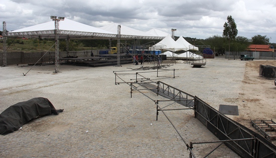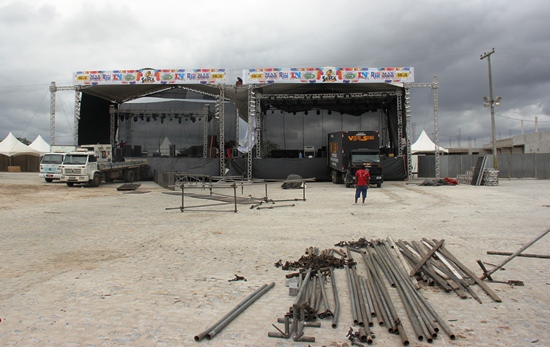 Foto tirada às 10h de quinta-feira, dia 17, já estava bastante avançado os serviços de palco.
