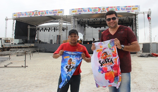 Marcinho da CLN ao lado de um funcionário apresenta a camisa do camarote (branca) e pista.