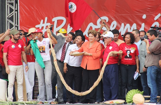 Antes de usar a palavra, Dilma recebeu uma cesta com produtos da agricultura familiar, uma maquete de cisterna de placa e uma rede presenteada por uma agricultura familiar do Piaui. “Os produtos são resultados do nosso suar e dos créditos agrícolas que estão melhorando nossas vidas; A cisterna, simboliza o fim da lata d’água na cabeça e a rede de caroá, é uma forma de simbolizar o resultado eleitoral de domingo, pois iremos vencer e não admitimos retrocesso”, falou a agricultora.