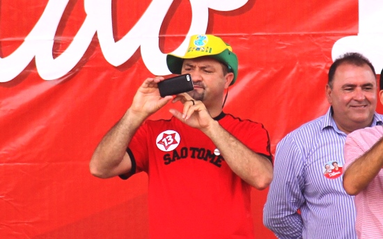 Natural de Capela do Alto Alegre, o folclórico Saquinho é conhecido por subir em palanques e tirar foto com artistas. Desta vez, conseguiu subir e com sua inseparável câmera na perdeu a oportunidade de fazer várias fotos. Capela foi com uma delegação formada por 40 pessoas que saíram de ônibus as zero hora e chegou às 06h em Juazeiro.