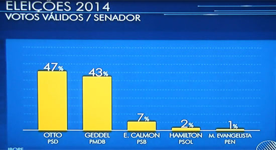 Em outra simulação feita pelo Ibope excluindo brancos, nulos e indecisos, ou seja baseando-se apenas nos votos válidos para o Senado a vantagem do Otto aumenta, 47% contra 43%. Eliana Calmon 7%, Hamilton Assis 2% e M Evangelista 1%