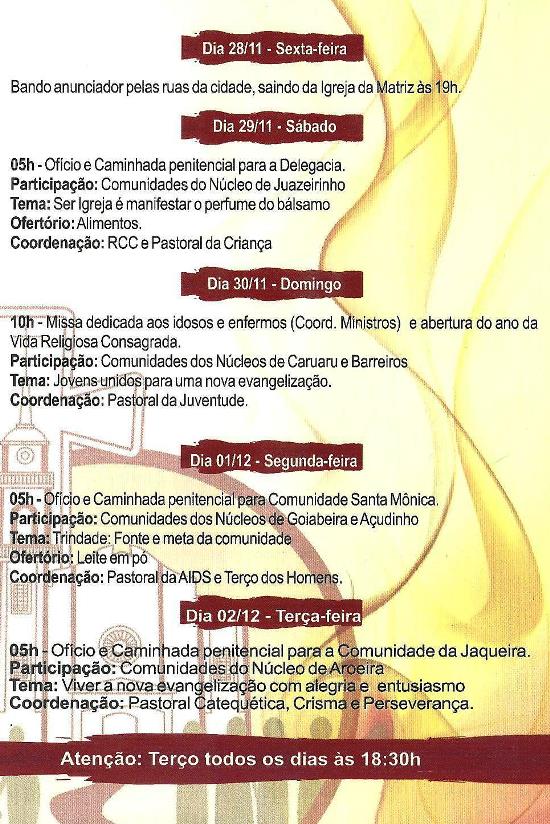 As atividades na Igreja Matriz terão inicio às 05h deste sábado (29) com Oficio e Caminhada Penitencial para a Delegacia de Policia. Participação Comunidades do núcleo de Juazeirinho. com o tema: ser igreja é manifestar o perfume do bálsamo. Ofertório: alimentos