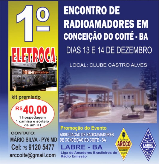 Em parceria entre a LABRE-BA (Liga de Amadores Brasileiros de Rádio Emissão), a ARCCO – Associação de Radioamadores de Conceição do Coité acontecerá entre os dias 13 e 14 de dezembro um grande encontro de Radioamadores, no Clube Castro Alves, onde acontecerá também, uma ‘eletroca’, rádios transceptores que serão expostos para a venda. A abertura do evento está programada para às 10h do dia 13, com a participação do presidente da LABRE-BA, Etevaldo Pereira – PY6 EP e demais autoridades convidadas.
