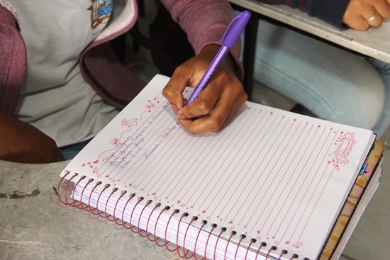 A jovem faz totalmente o inverso dos demais colegas e certamente de milhões de pessoas, quando inverte a posição do caderno para fazer as atividades. A posição normal é a escrita na ordem decrescente, mas ela começa o texto na parte de baixo e segue a ordem crescente.