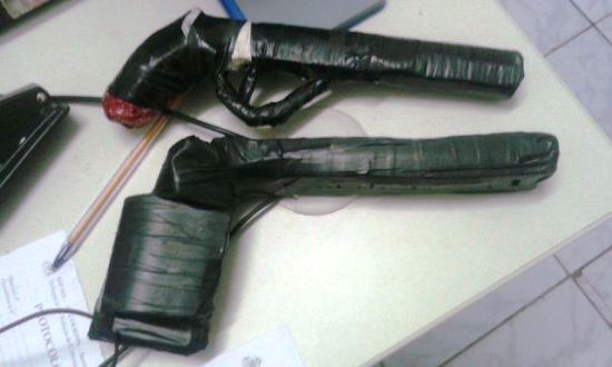 A Polícia Militar informou que os dois estavam trafegando as ruas da comunidade a bordo de uma motocicleta sem placa e em posse de duas armas falsas, fazendo ameaças aos moradores.