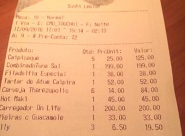 “Quando chegou a conta, a gente foi pagando meio sem conferir. Estava cara, mas como bebemos caipirinha, comemos sushi, achamos que o valor estava correto. O marido de uma das meninas viu na conta o carregador como R$ 200. Reclamamos e o garçom disse que ia estornar. Eu já tinha passado o cartão, minha amiga também”, conta Michelle, que esteve no restaurante com amigos no sábado (17).